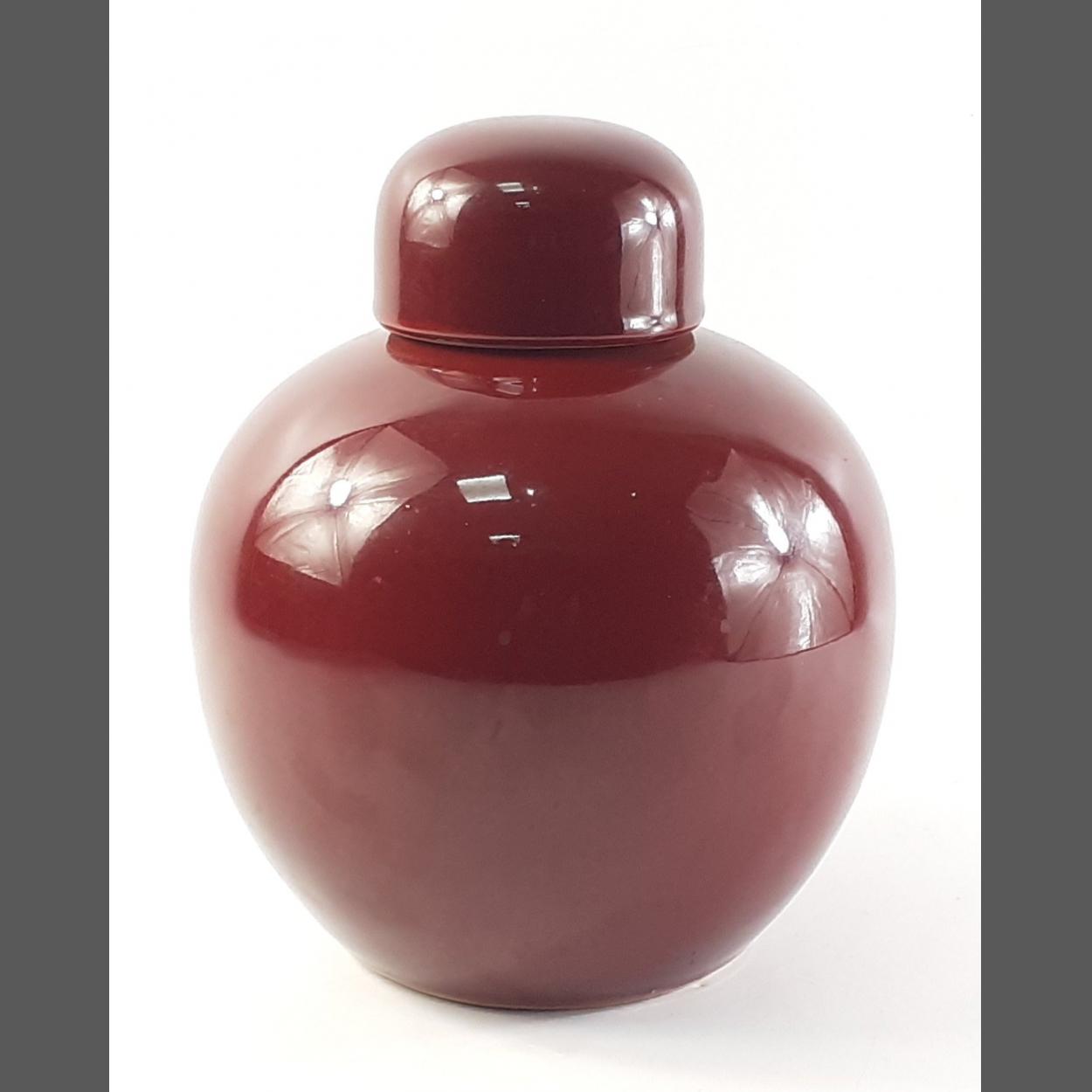 A classic deep red flambe style Oriental lidded ginger jar. 25cm tall approx. Lovely light green interior, no makers' marks or impressions.