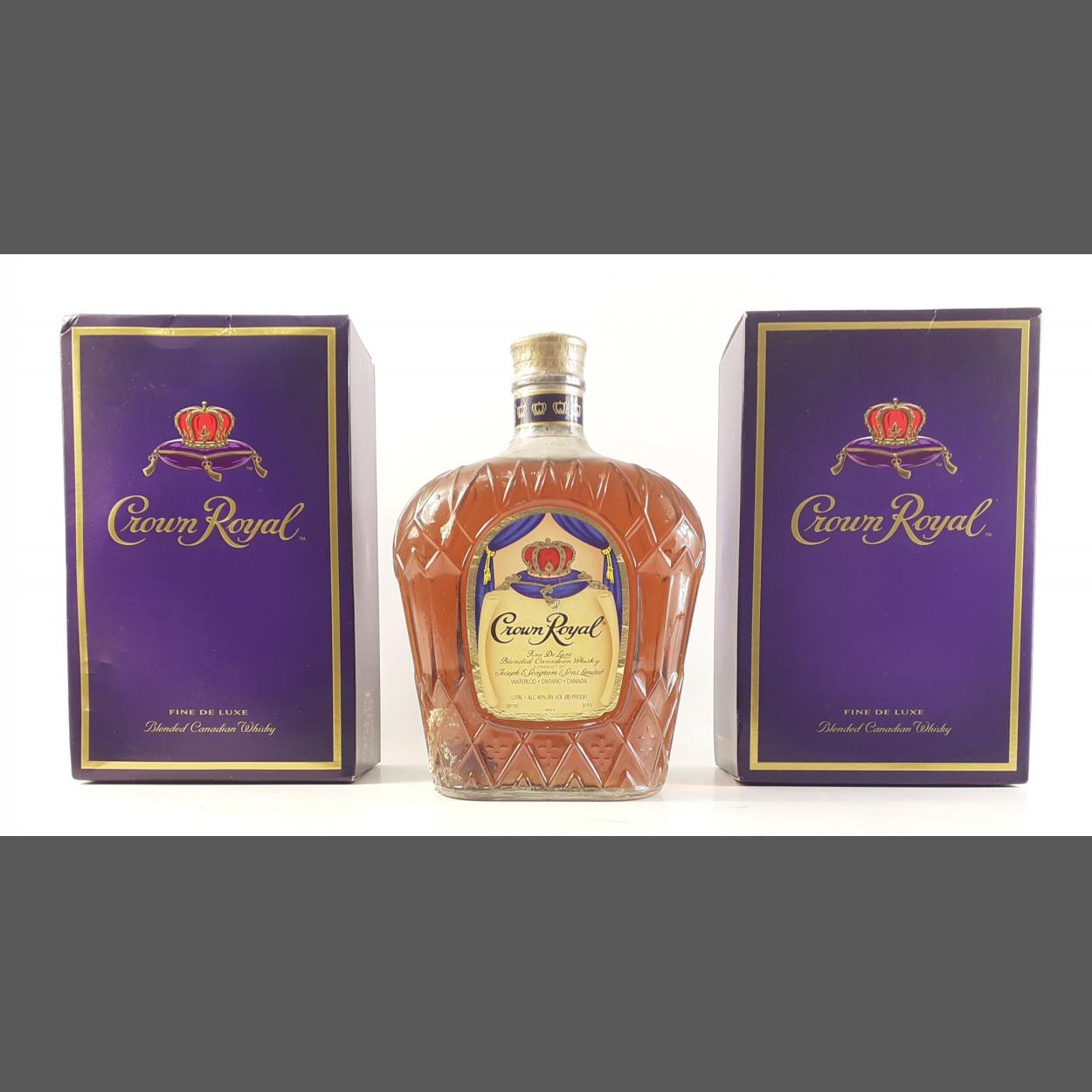 CROWN ROYAL Fine De Luxe Blended Canadian Whisky. Three One Litre bottles. Two boxed, one unboxed.