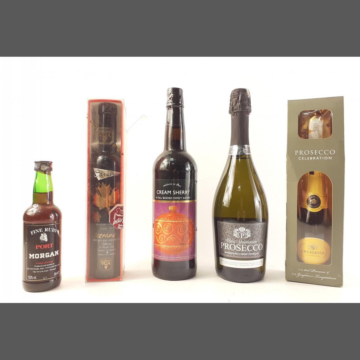 A GUID NIGHT IN selection of bottles. Comprising one 75cl Prosecco, one 20cl Prosecco, one Cream sherry and 20cl Port and a boxed STREWN Canadian wine.