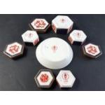 A set of 4 ROYAL CROWN DERBY hexagonal trinket boxes (A1295), largest 7.5 x 7.5cm plus an Imari trinket dish (11cm dia.). All in excellent condition