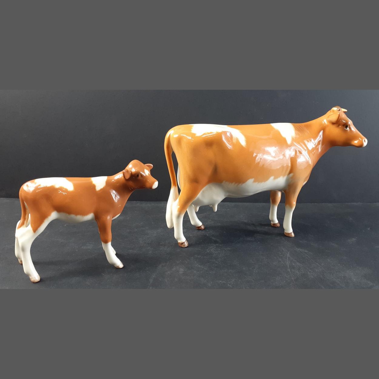 A BESWICK Ayrshire cow (17cm approx) and calf with matching markings. No damage.