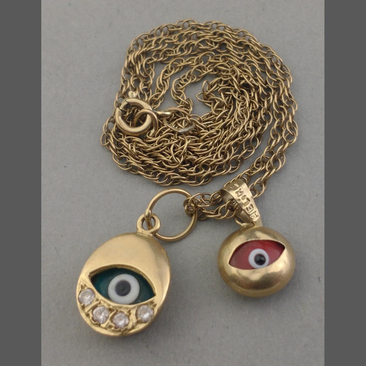 An evil eye pendant, smaller of two pendants stamped 585 MELIKE. Chain 48cm approx. Gross weight 4.42g approx
