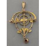 A 9ct stamped EWARDIAN pendant/brooch with a small garnet and studded with seed pearls - dimensions 4.5cm height x 2.5cm width approx and gross weight 2.29g approx