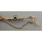 A 9ct stamped EDWARDIAN bar brooch with three AQUAMARINE stones accompanied with two small seed pearls - it has a base metal pin - and safety chain - 5 cm in length and gross weight 2.35g approx