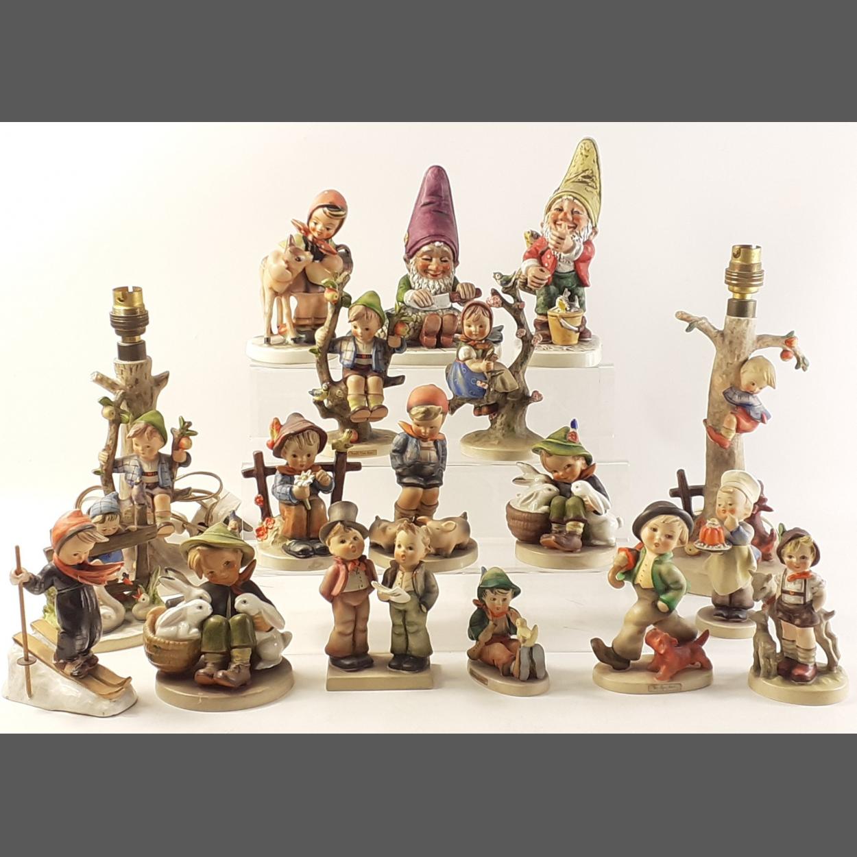 A good collection of HUMMEL and similar West German figures to include two pretty table lamps and much else. Over fifteen figures, some damage noted to a couple.