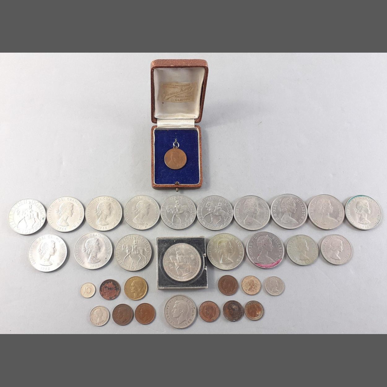 Small collection of coinage of interest to include several modern Crowns, 1902 Coronation medal, farthings etc.