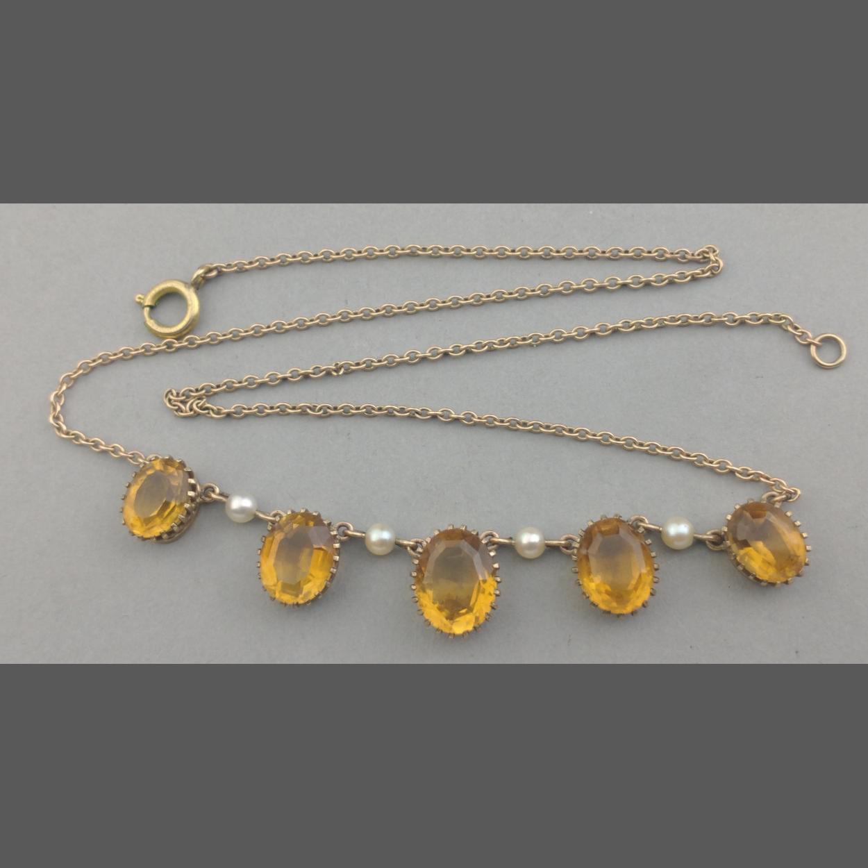 An EXQUISITE VINTAGE AMBER 375 stamped necklace with 5 amber oval-cut pieces and 4 seed pearls - gross weight 9.97g approx . Length 42cm approx