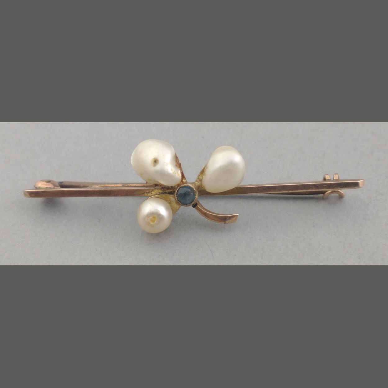 A PRETTY 9ct stamped pin bar brooch in floral form with three pearls and a small blue faceted stone centred - 4.5cm length approx and weight gross 1.98g apx