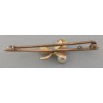 A PRETTY 9ct stamped pin bar brooch in floral form with three pearls and a small blue faceted stone centred - 4.5cm length approx and weight gross 1.98g apx