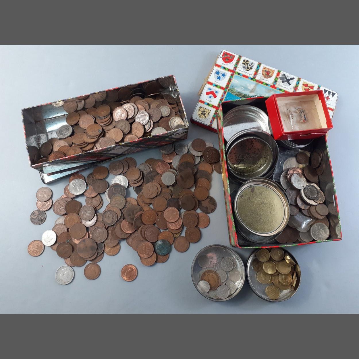 A collection of obsolete UK coinage in two tins, comprising copper coinage, nickel and thruppenny bits. A good collection.