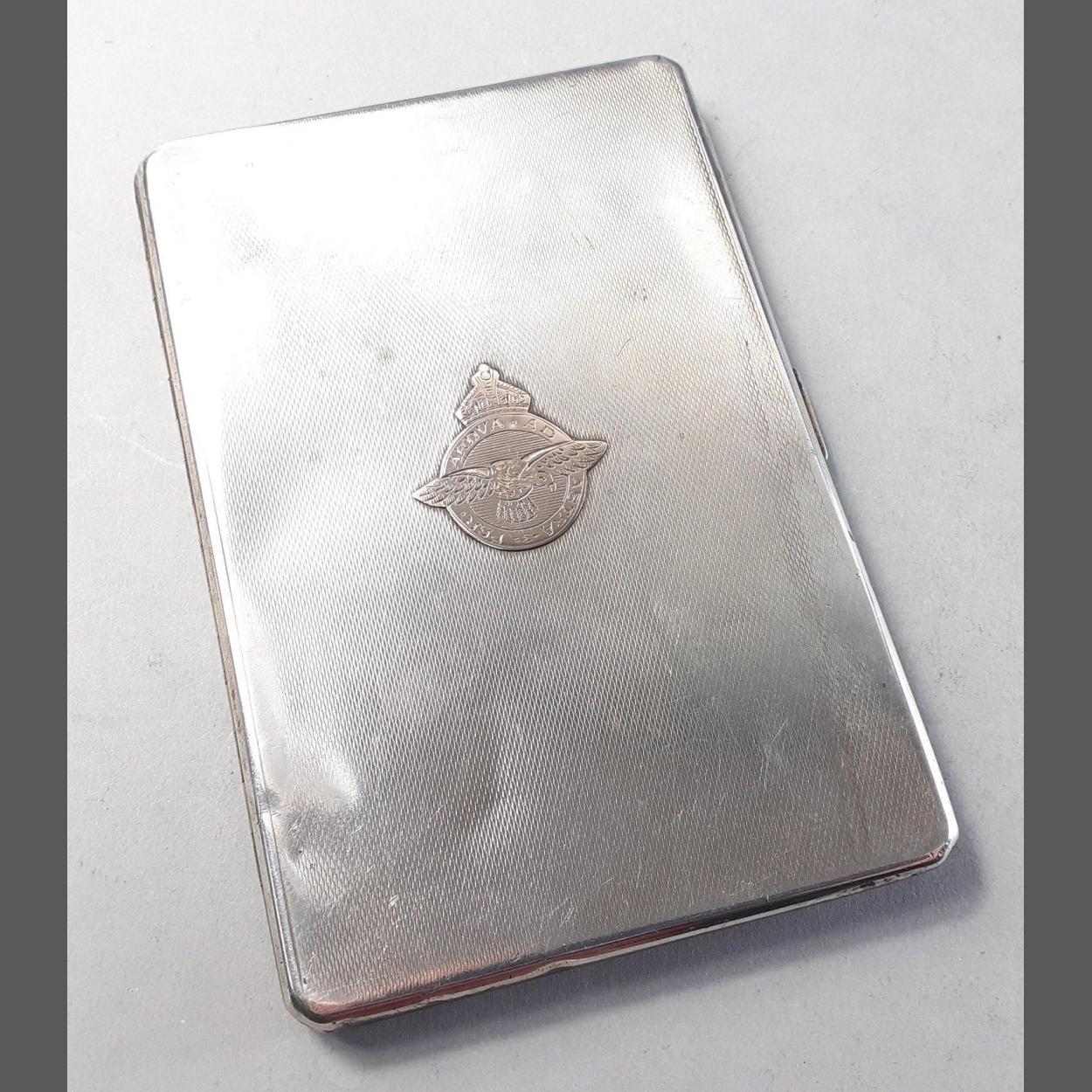 A silver hallmarked engine turned cigarette case with RAF badge applied on front. Indistinct hallmarks possibly 1938. A few minor marks but no major dings etc. 12cm x 8cm. Weight 190g approx.