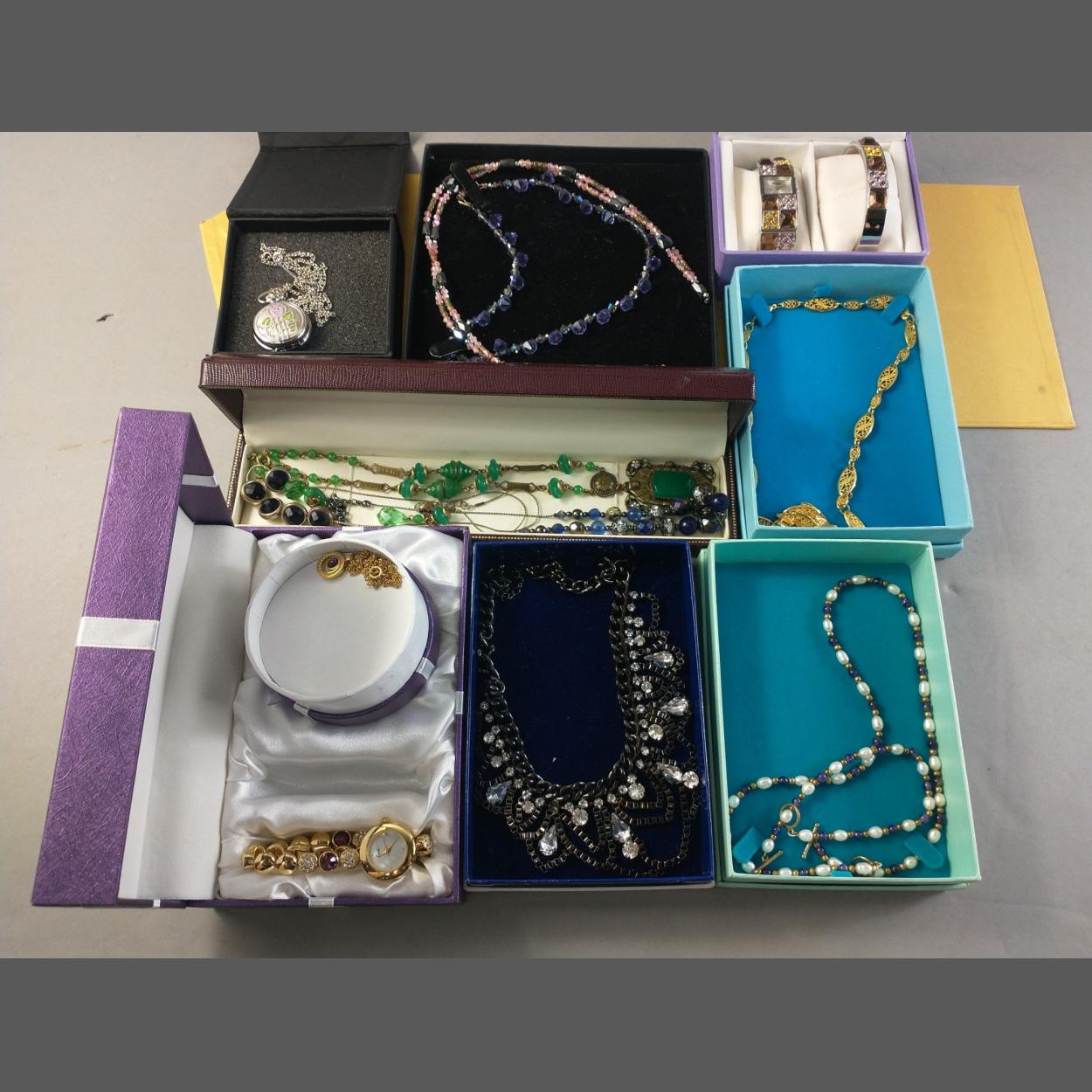 A good selection of boxed jewellery to include two watch sets, necklaces, gilt items and others.