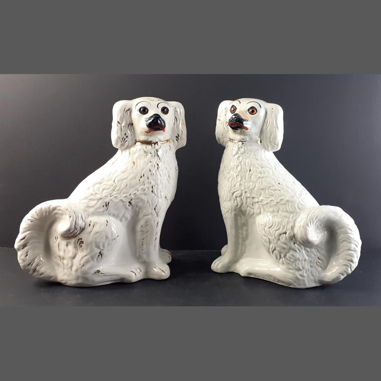 A very attractive pair of large Staffordshire King Charles Spaniel ''WALLY DUGS''. Particularly well sculpted with curled tails, glass eyes and gilt and coloured highlights. Each 32cm tall and in lovely condition with a couple of expected light firing crack but no chips, cracks or repairs. A beautiful pair!