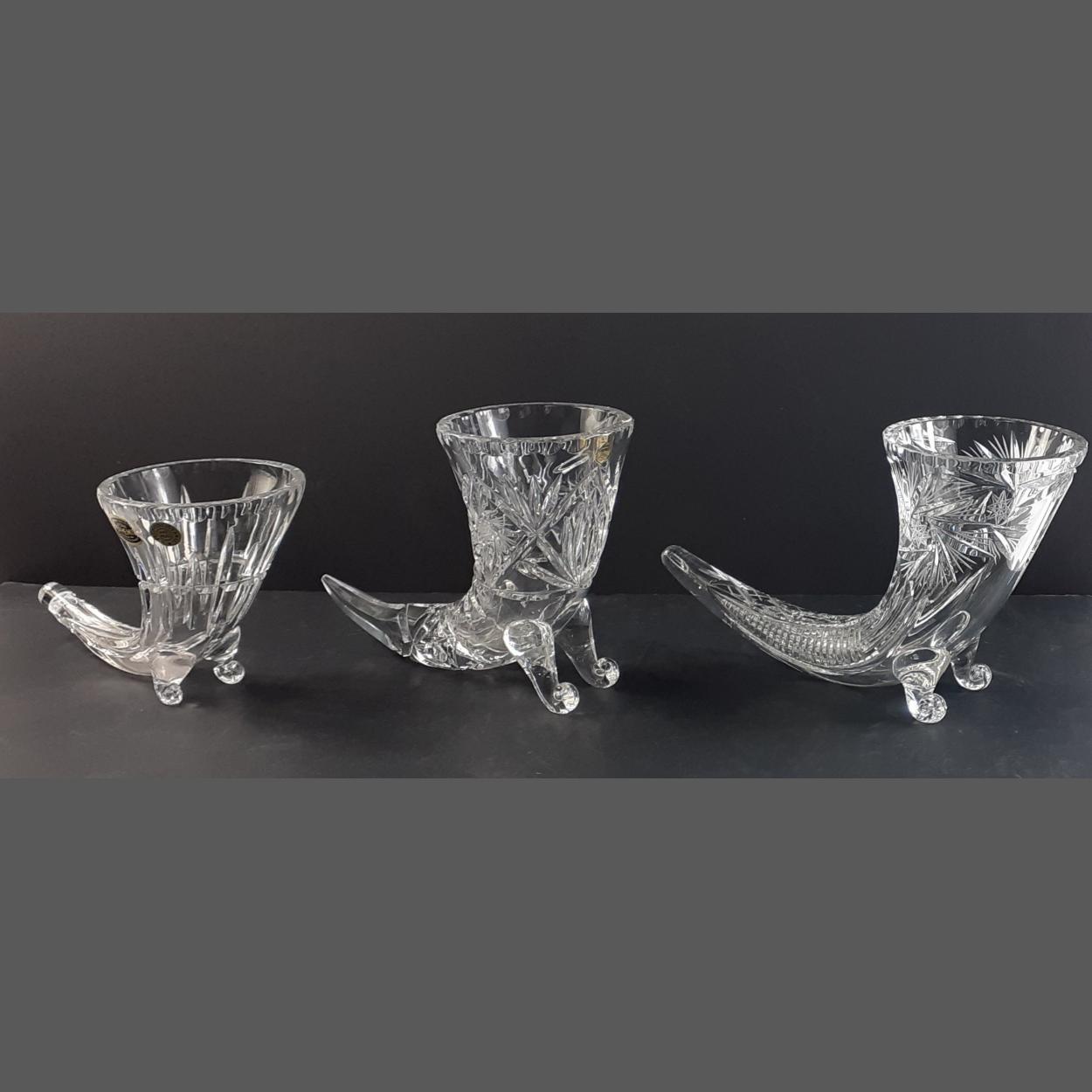 Three lead crystal cornucopias made in Poland. Tallest 18cm approx. No damage
