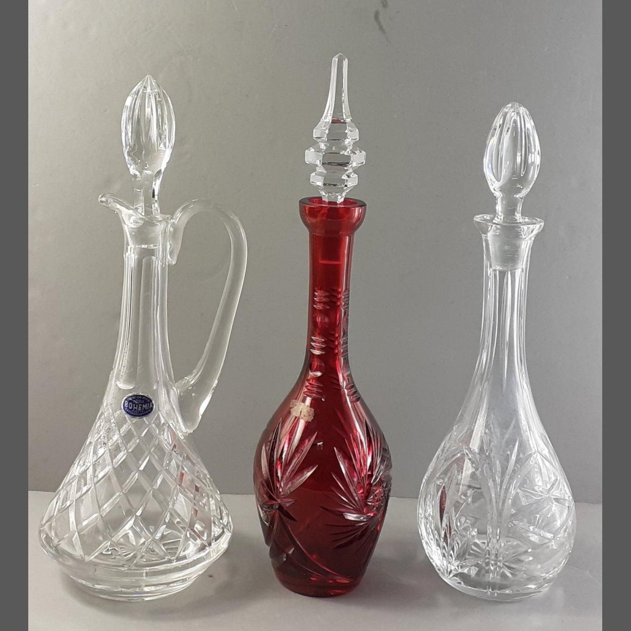 A large Bohemian lead crystal claret jug standing 41cm high approx, plus a tall (43cm) cranberry glass decanter and one further decanter (40cm approx)