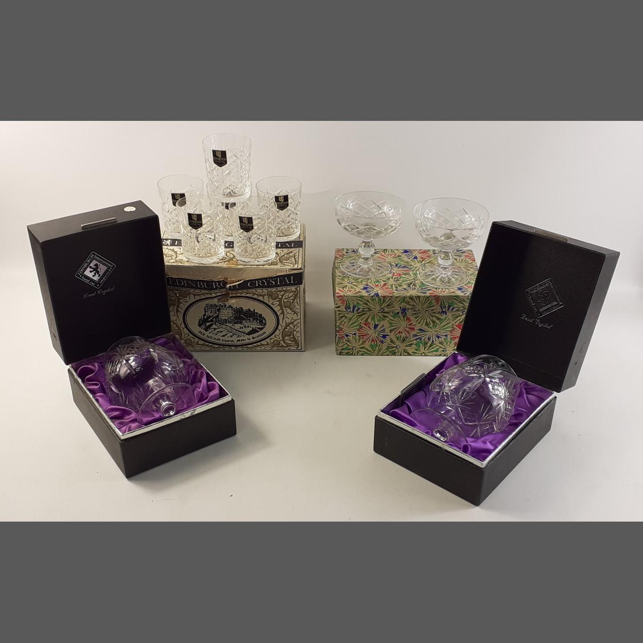 A pair of boxed EDINBURGH INTERNATIONAL CRYSTAL brandy balloons, a box of 6 first quality EDINBURGH CRYSTAL Highland Suite small whisky tumblers with stickers and a boxed pair of unmarked sundae dishes. No damage noted.