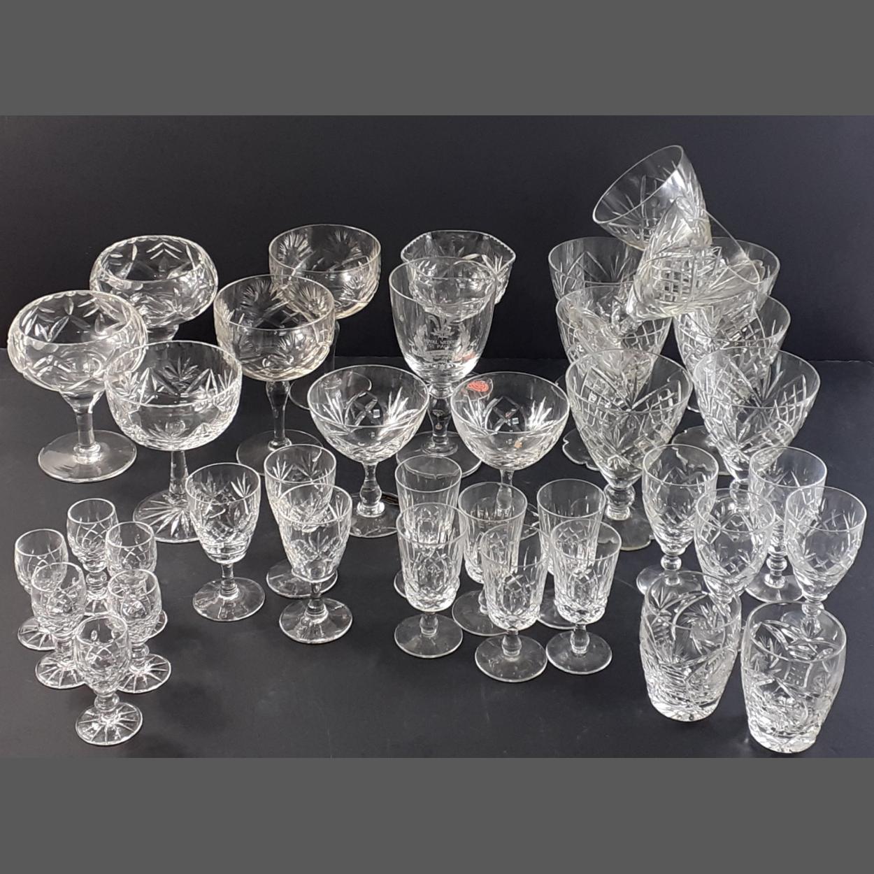 A box of assorted crystal glassware to include wine glasses, liqueur glasses, sherry glasses etc.