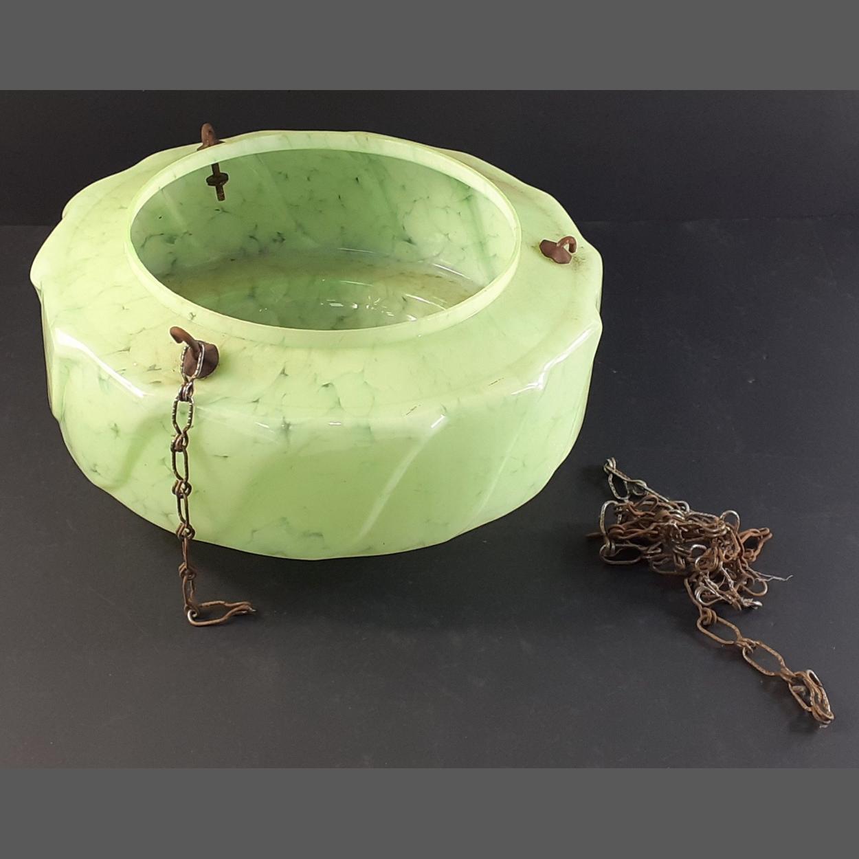 A vintage green glass plafonnier with rusted chains. Diameter 30cm approx. In good condition.