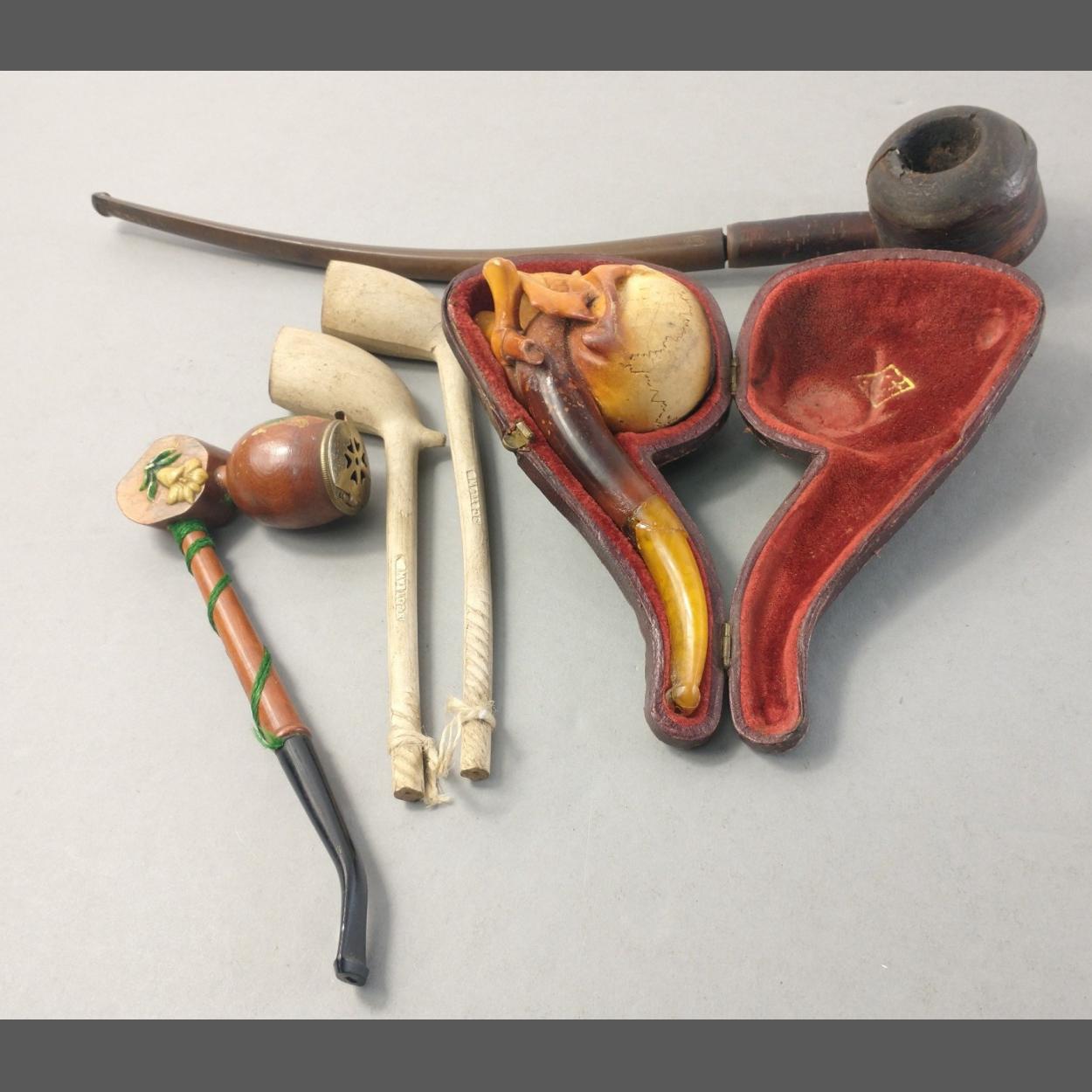 A vintage skull Meerschaum pipe in fitted case. Damage repaired to the stem. Two clay pipes and others.