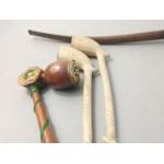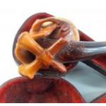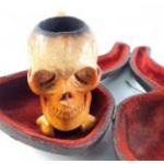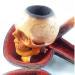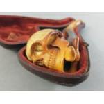 A vintage skull Meerschaum pipe in fitted case. Damage repaired to the stem. Two clay pipes and others.
