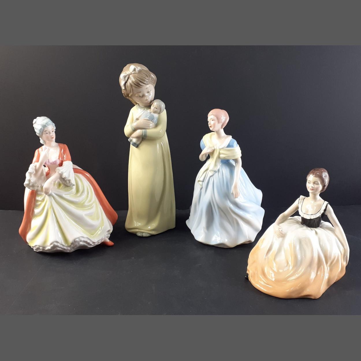 Four attractive decorative ornamental pieces to include little Spanish girl with doll, a 1978 Staffordshire seated girl Francesca and two Taiwan made Ladies. All in good order.
