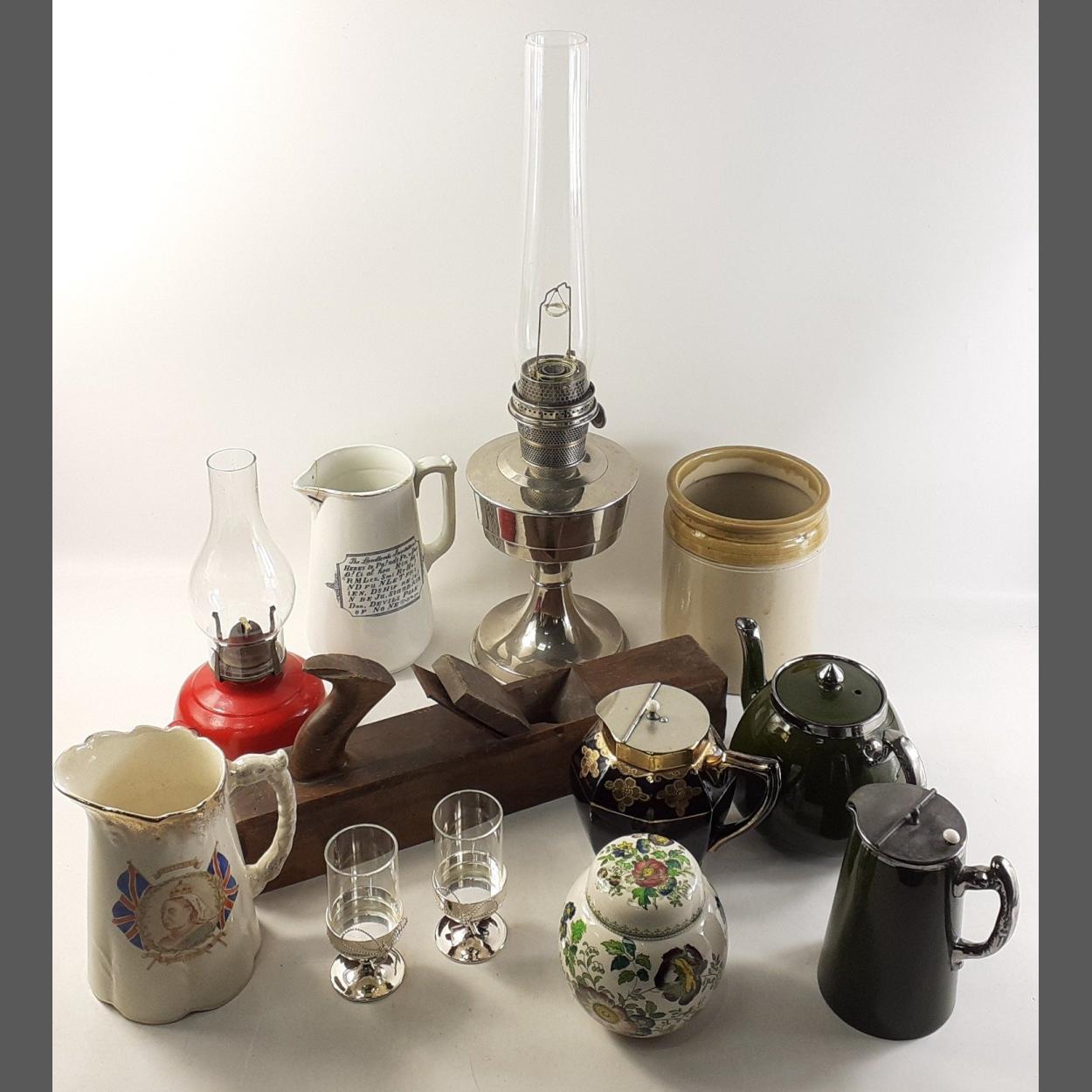 A mixed lot to include 2 oil lamps with chimneys, Victorian water jug, large wood plane, large jug and others