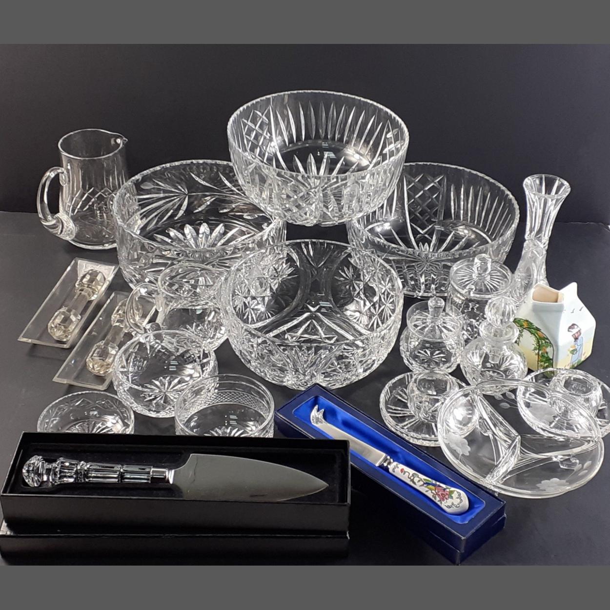 A mixed glassware lot to include 4 large crystal bowls, Waterford crystal cake knife, milk jug, knife rests, trays and others