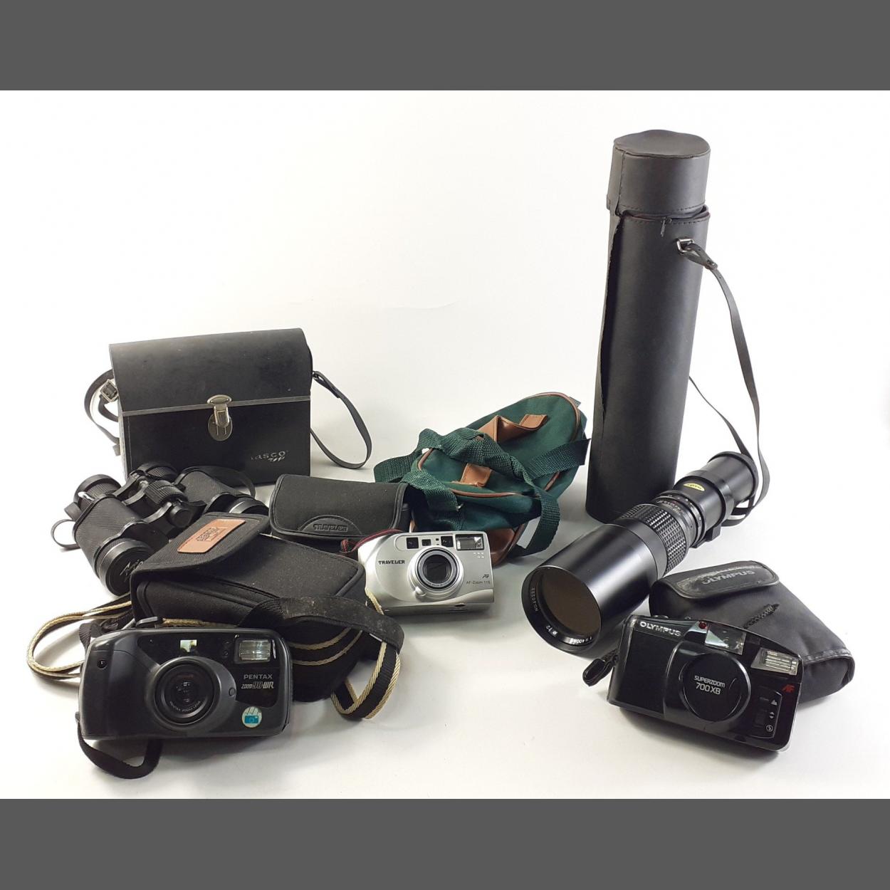 A mixed lot to include OLYMPUS super zoom camera, TASCO 103Z binoculars in case, Pentax camera in case PRINZA 400mm zoom lens and others.