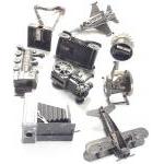 A box of unusual metal ornament pencil sharpeners. Camera, Organ, Sewing machine and many more.