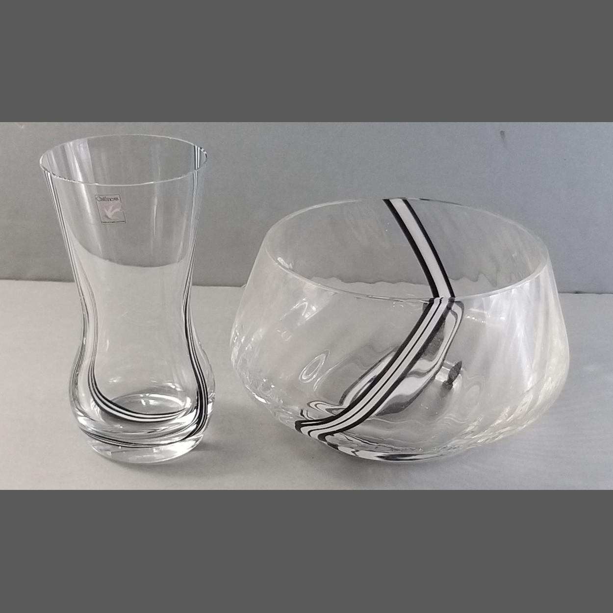 A CAITHNESS black and white ribbon stripe bowl 23cm and a matching 18cm vase. Both in good condition.