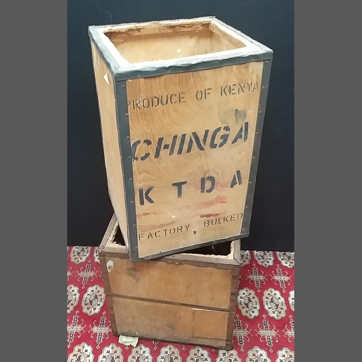 Two handy tea chests, the smaller stamped "Chinga produce of Kenya". Larger is unbranded and measures 46cm square.