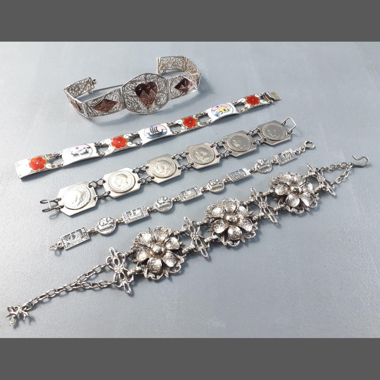 Good quality collection of five stylish bracelets to include Scandinavian themed unmarked bracelet with enamel panels, a pierced worked bracelet with yellow metal applied panels and one other of floral design.