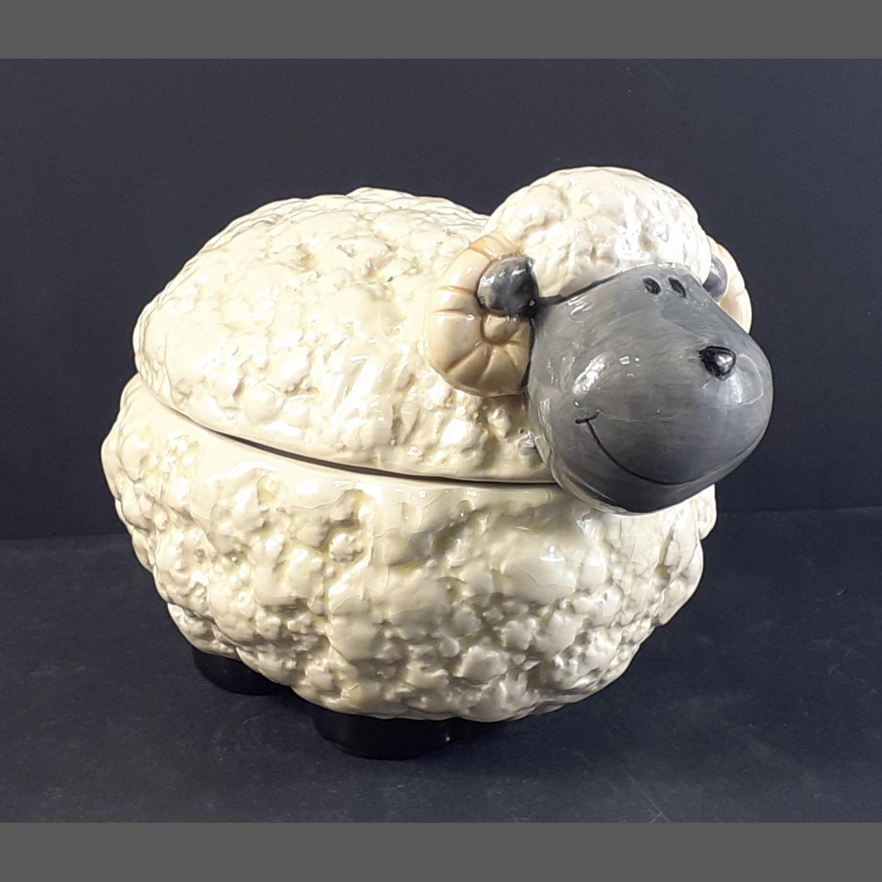 A humorous egg store jar in the shape of a sheep. 22cm approx. Note rubber seal perished.