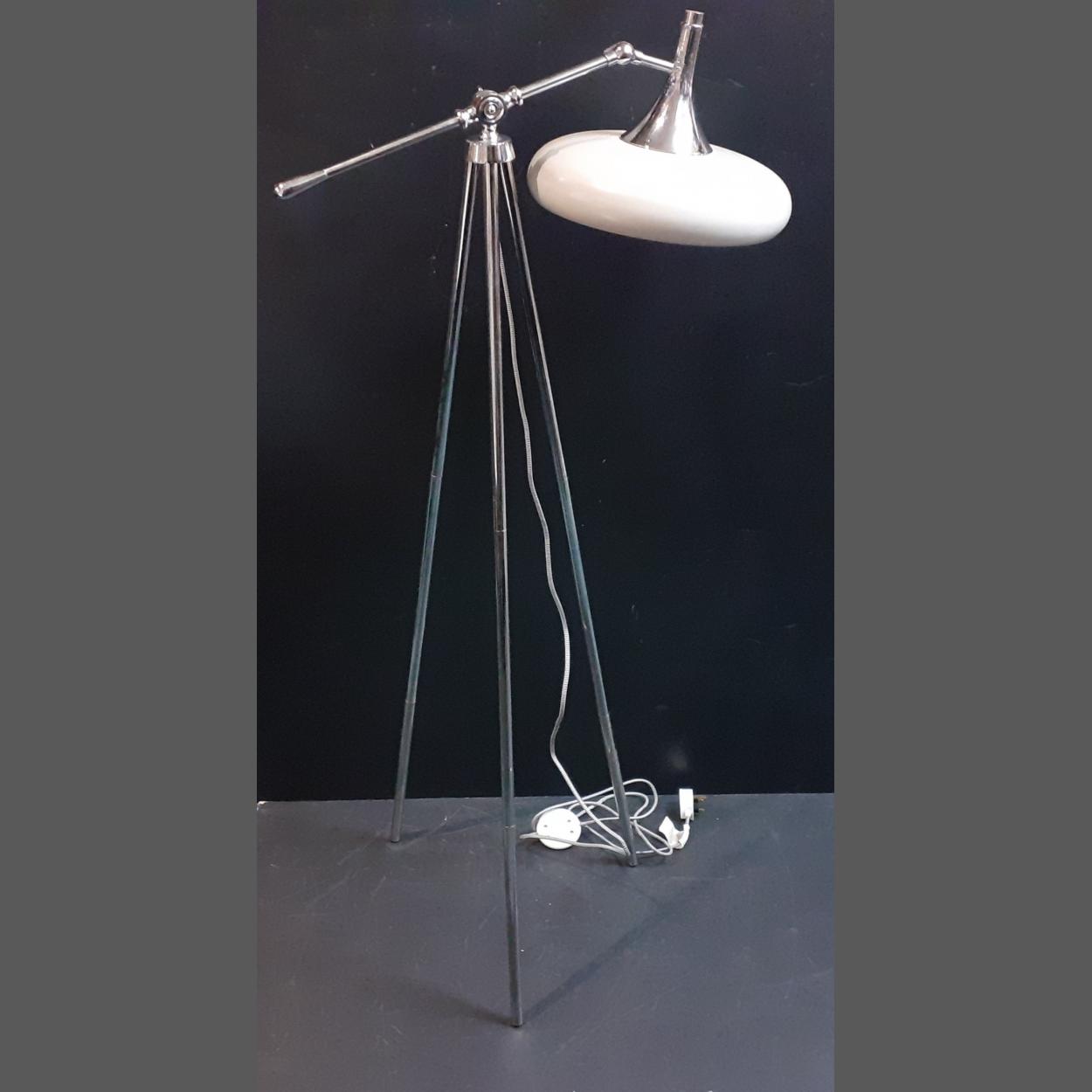 A retro style chrome tripod standing lamp with floor switch and adjustable height. Stands 140cm high approx. May need re-wired