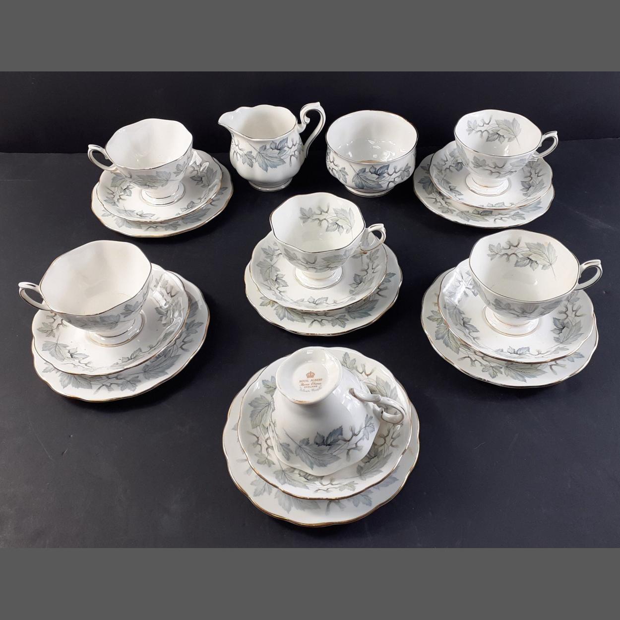 A ROYAL ALBERT tea service in the SILVER MAPLE pattern to consist of 6 cups, 6 saucers, 6 side plates, milk and sugar bowl