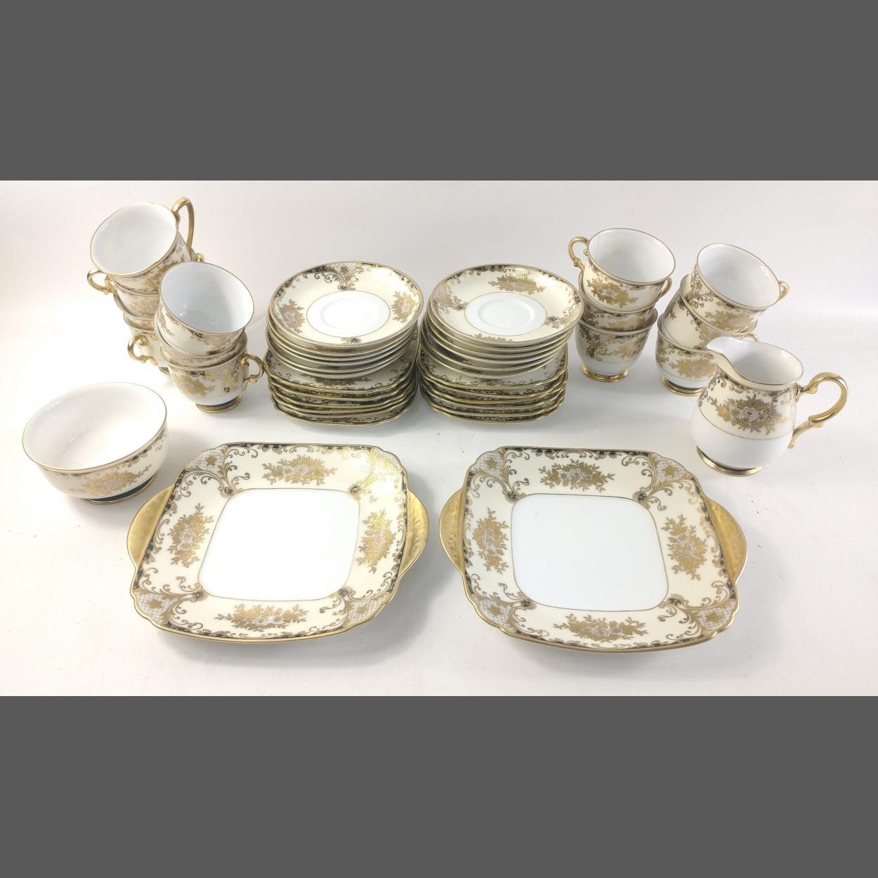 A MEITO hand-painted gilt tea service comprising 12 teacups (one damage repaired), 12 saucers, 12 side plates, 1 milk jug, 1 sugar bowl and one additional cup