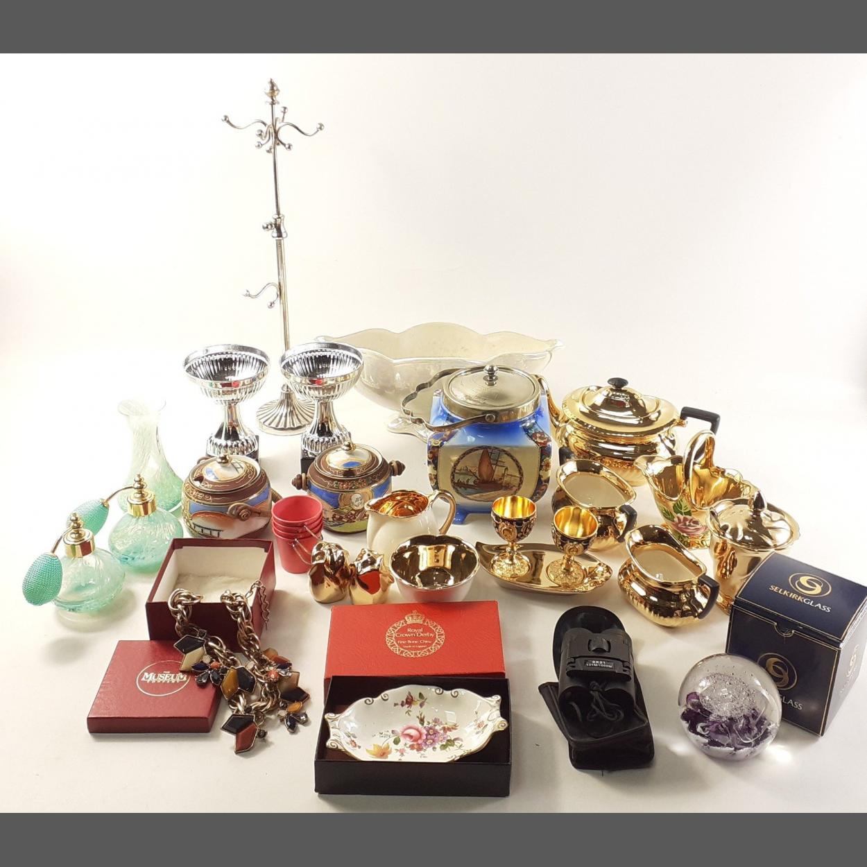 A mixed decorative lot to include a boxed SELKIRK glass paperweight, ROYAL CROWN DERBY trinket dish, 2 CAITHNESS glass atomisers, CAITHNESS glass posy vase, ROYAL WINTON Golden Age lidded jam pot, CROWN DEVON teapot and milk jugs and much, much more