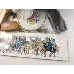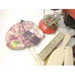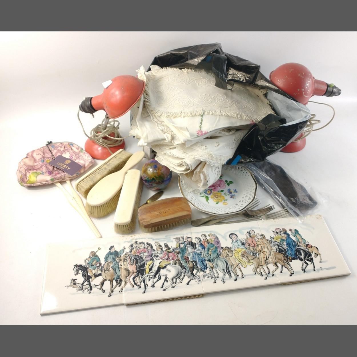 A mixed box to include bone dressing table brush set, a bag full of linen placemats etc, 2 red angle poise lamps, a pair of brown leather gloves, 4 tiles (15 x 15cm approx) illustrating The Canterbury Tales, a LIBERTY of London make-up bag (with tag), some cutlery etc