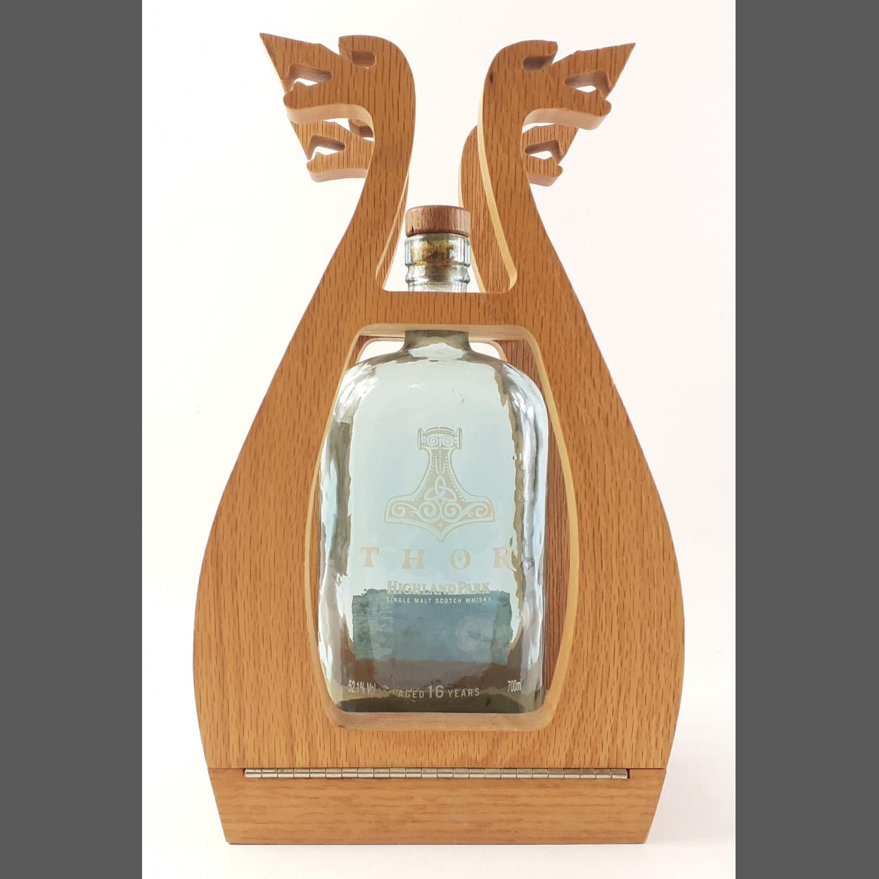 HIGHLAND PARK THOR 16 YEAR OLD single malt Scotch whisky from the Valhalla Collection, 700ml BOTTLE ONLY in Viking longship style wooden case. Stands 32cm high approx