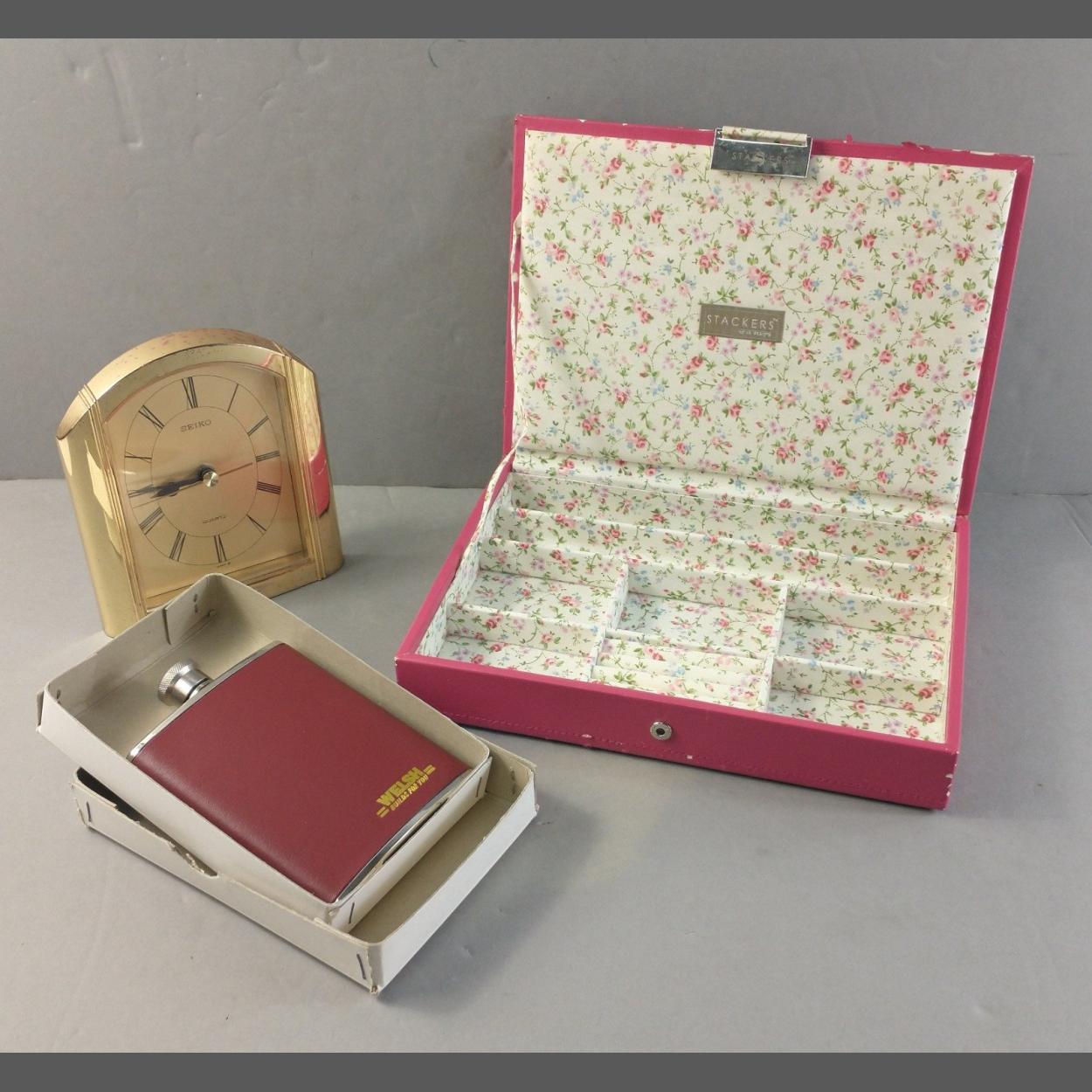 A collection of items to include a lidded jewellery box, a small SEIKO quartz mantle clock, a boxed hip flask in new condition