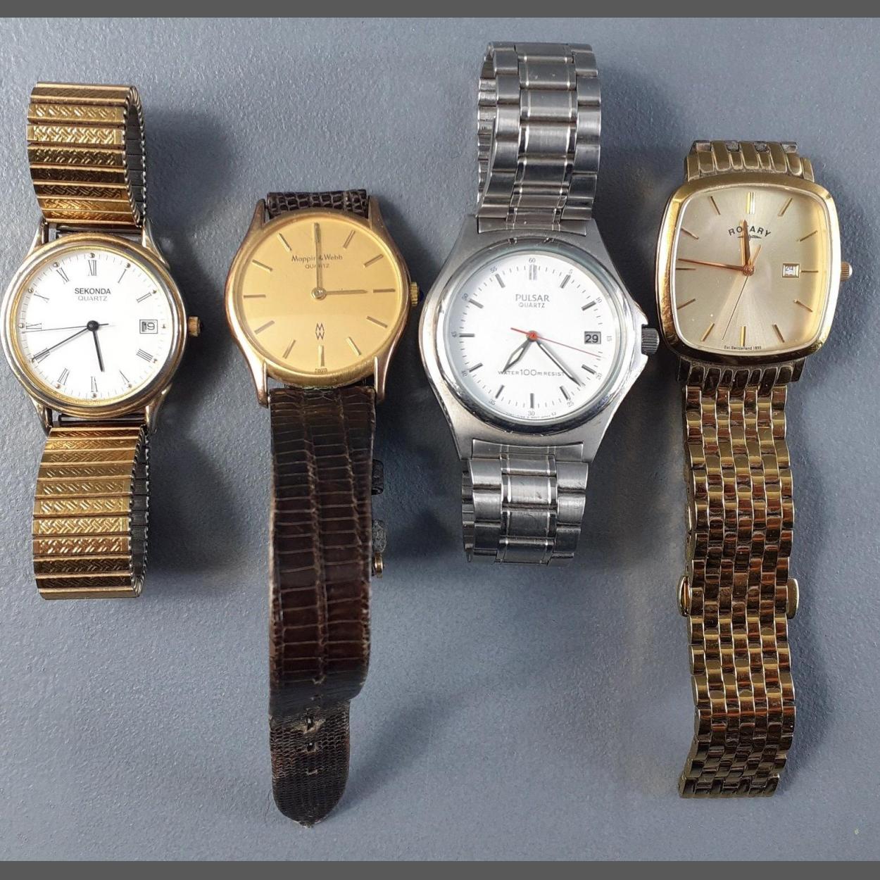 A small collection of four gents dress watches to include a non-running MAPPIN & WEBB, Pulsar Quartz, Sekonda and Rotary. May require batteries.
