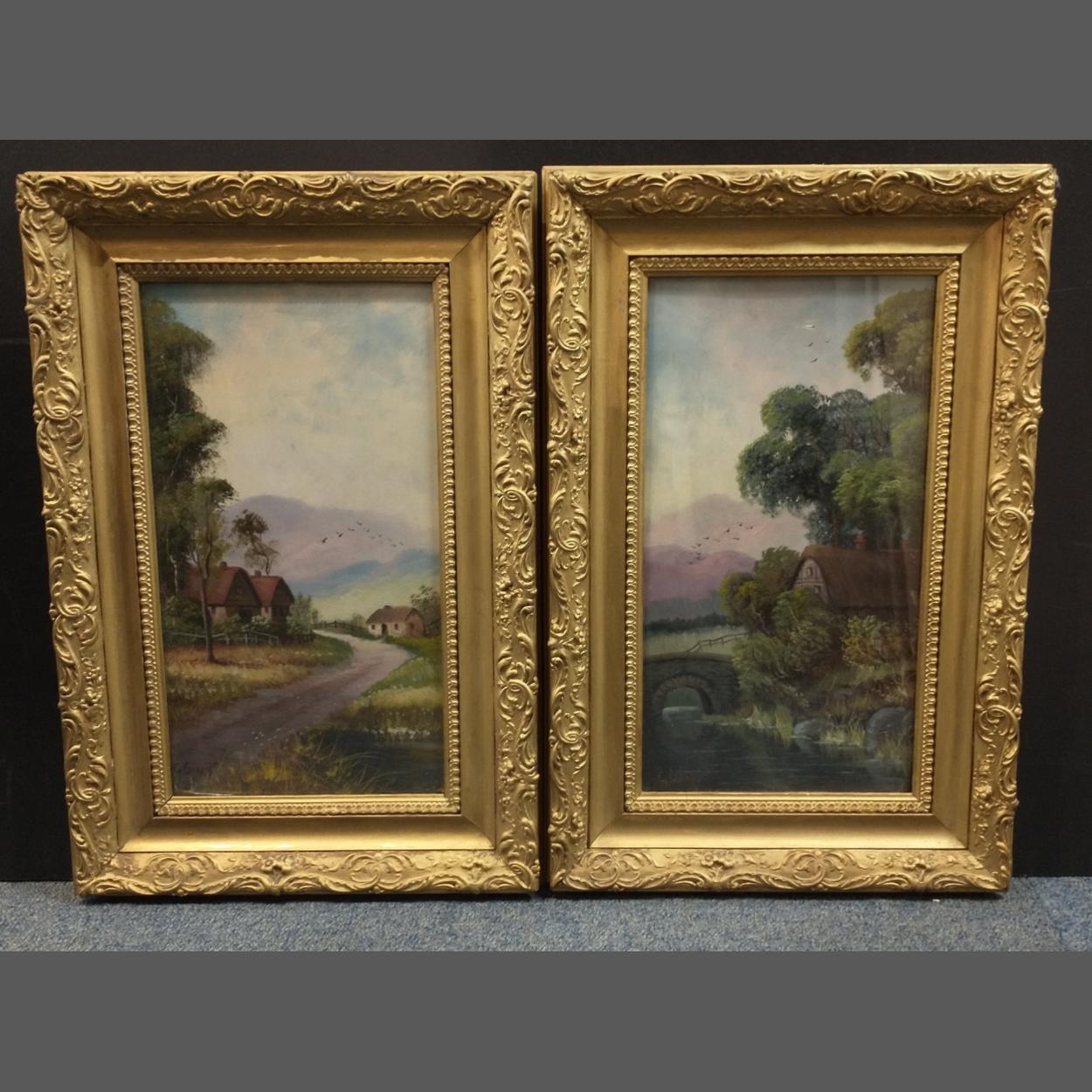 Two pretty country scenes oil on board pictures in heavy gilt frames. Both signed G CROSBY. Size 60cm x 40cm approx.