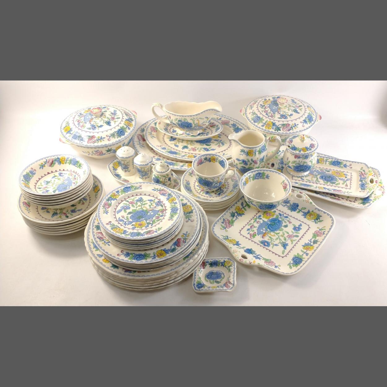 Dinner service MASONS IRONSTONE in Regency pattern, comprising four larger 30cm serving plates, two lidded tureens, six dinner plates, five starter plates, six side plates, six soup bowls, six pudding bowls, sauce boat, sugar bowl and others. A pretty and useable service