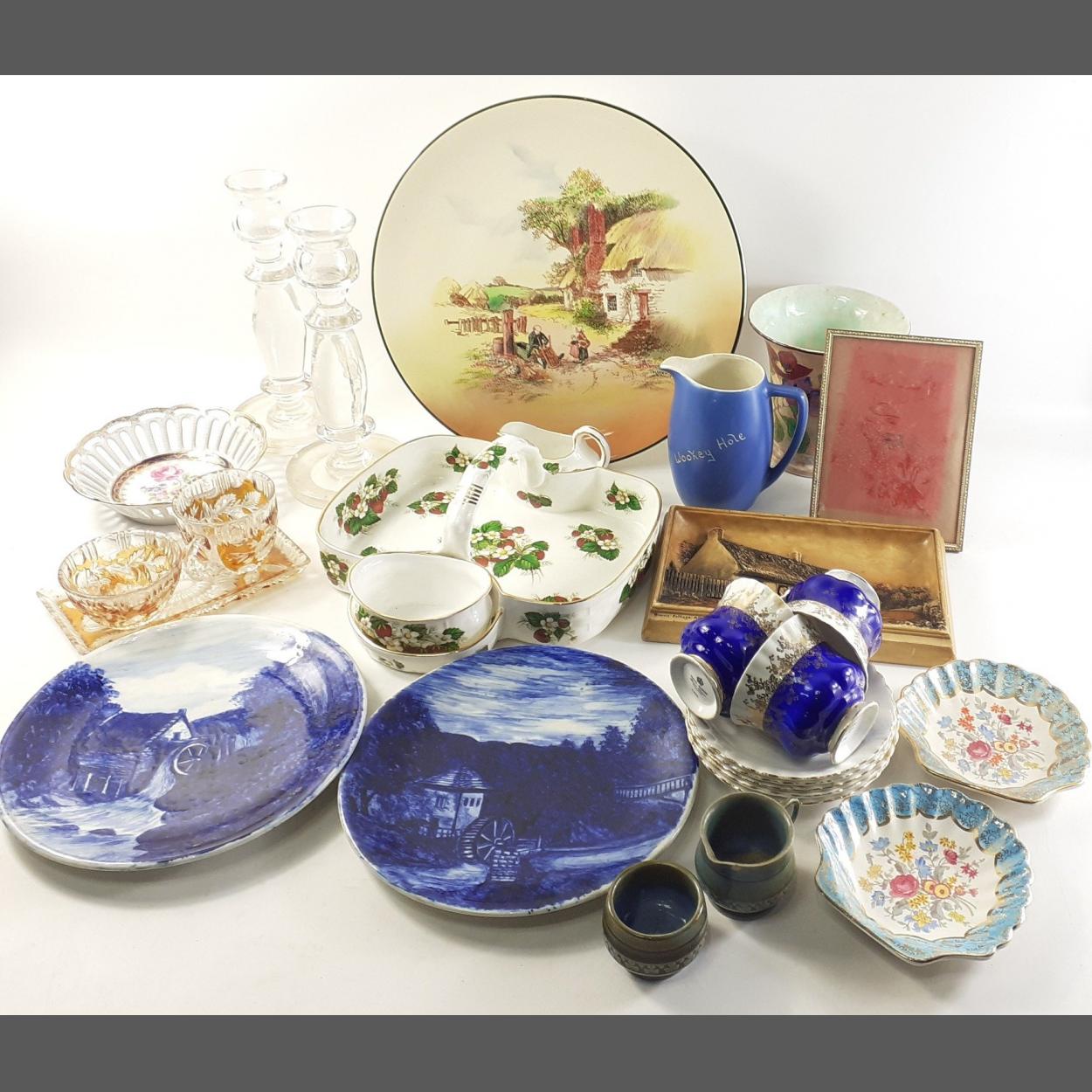 Assorted collection of ceramics to include Royal Doulton plate, Hammerly tray, some fancy glassware, Royal Albert gilt cups, a pair of large glass candlesticks A/F and others.