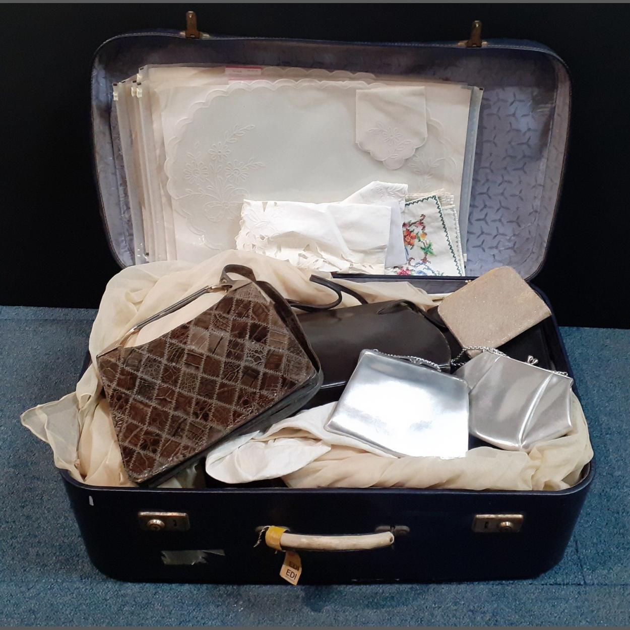 A collection of ladies handbags to include Selkirk Tanneries with advertising plaque and others. Includes a vintage suitcase with ladies dresses etc. and some table linen.