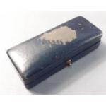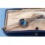 A gorgeous 585 stamped bar brooch with impressive faceted central blue stone. 6cm approx and presented in an older jeweller's box. Gross weight 3.9g approx