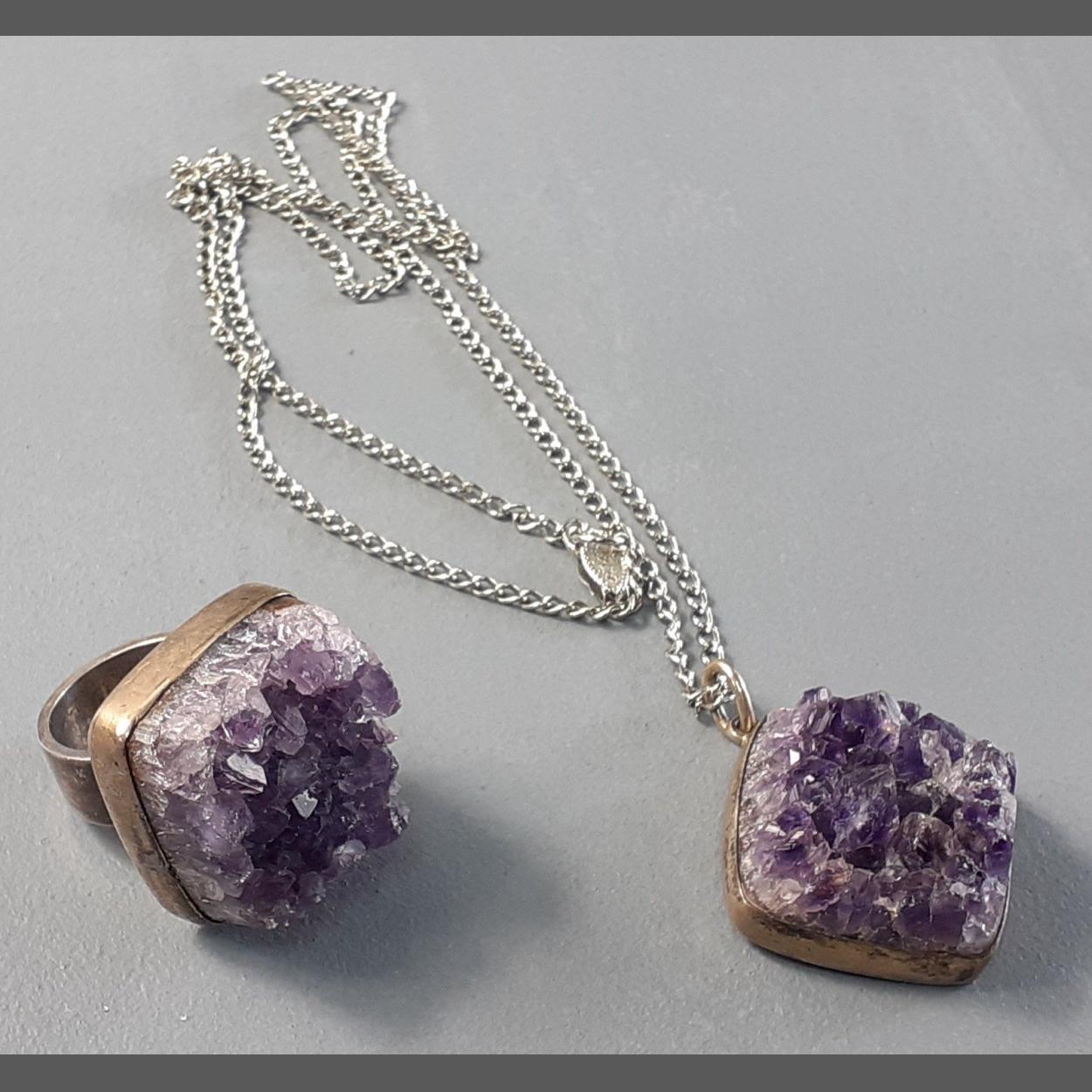 STERLING DENMARK stamped raw amethyst ring and pendant on chain. Stamped BENT K (BENT KNUDSEN)