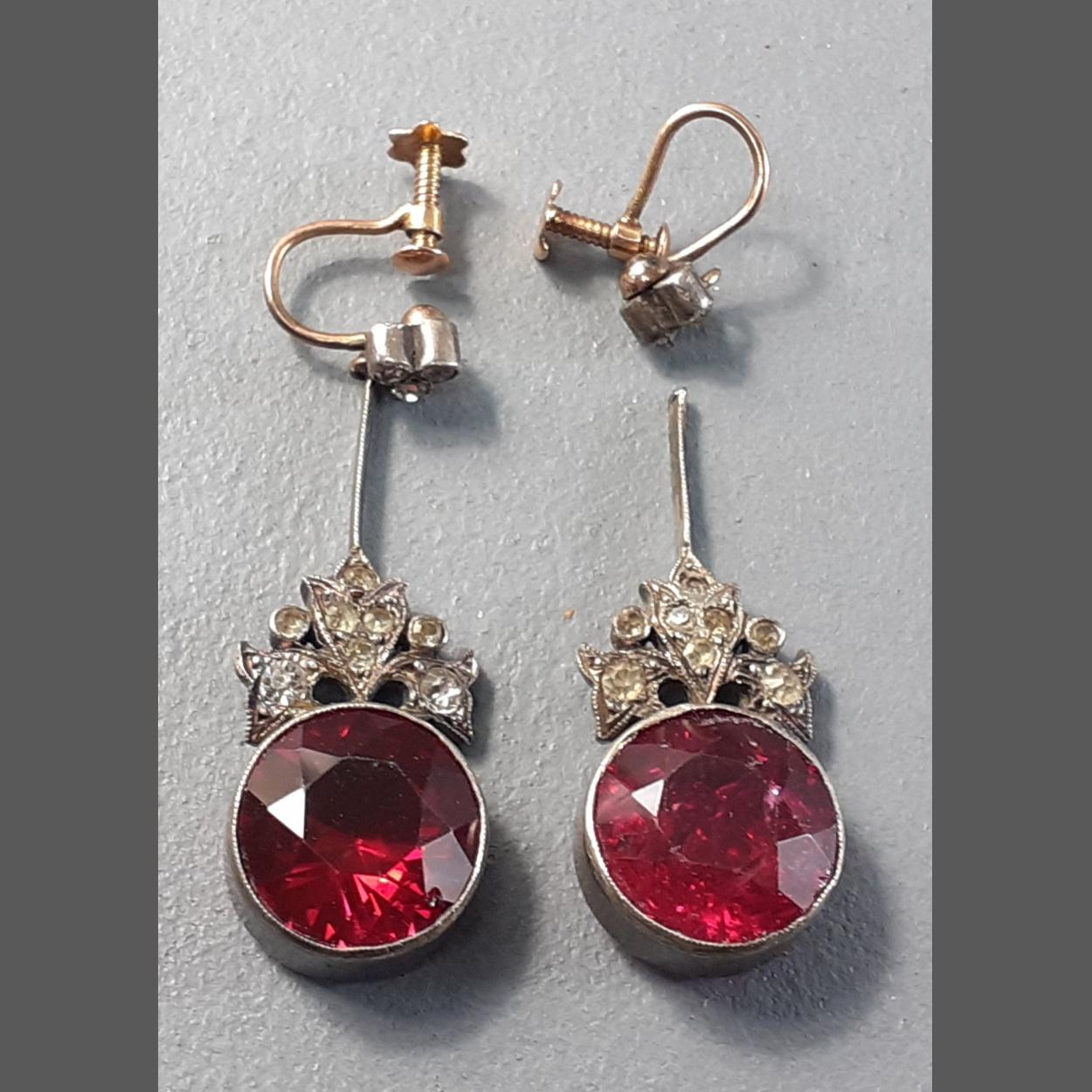 A 9ct stamped to stem pair of earrings with large red stones. Tops only appears 9ct. One backing broken. Total gross weight 8.65g approx