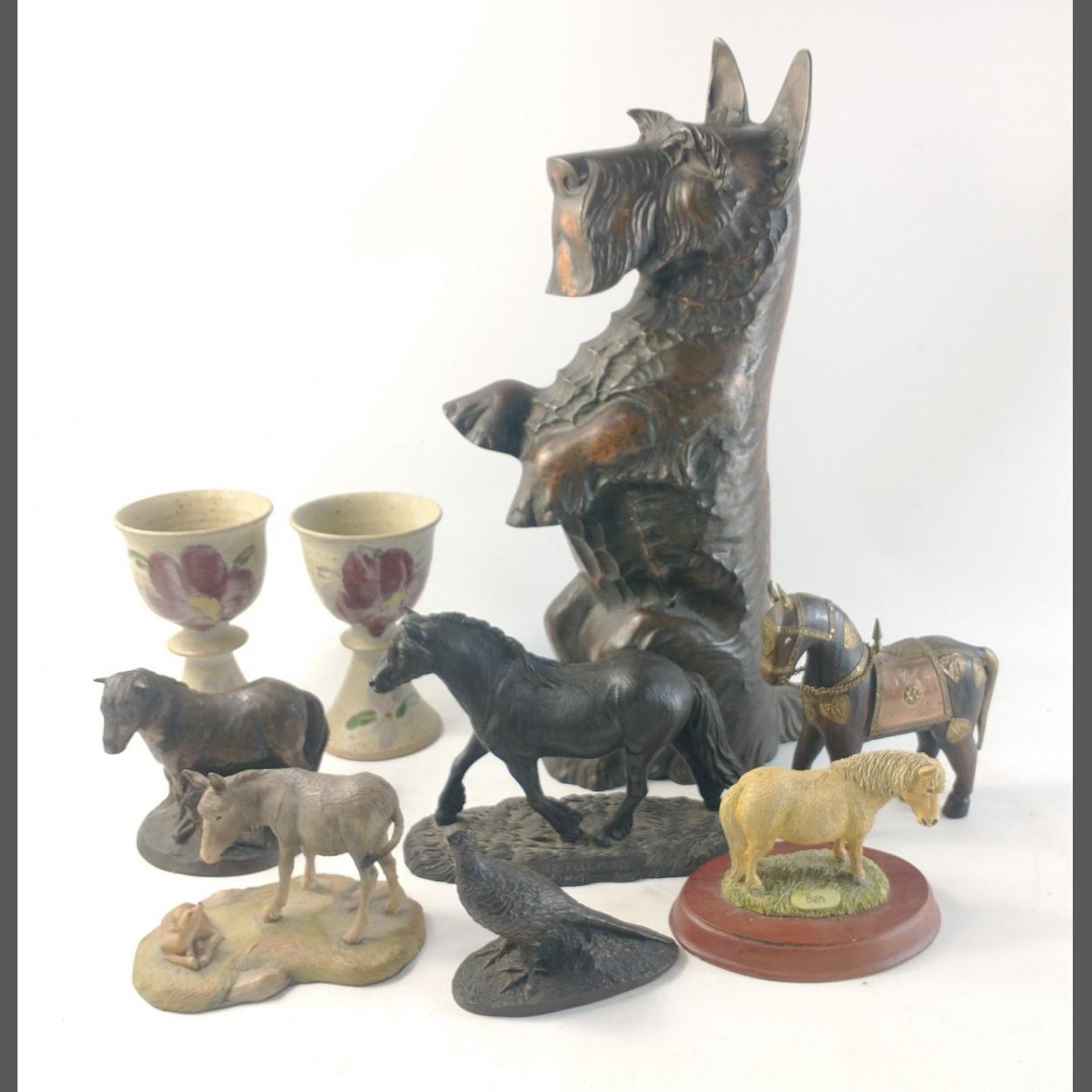 A collection of decorative and ornamental items to include several animal ornament include bronze pit pony, a pair of stoneware goblets and a very impressive brass effect Scottie dog.