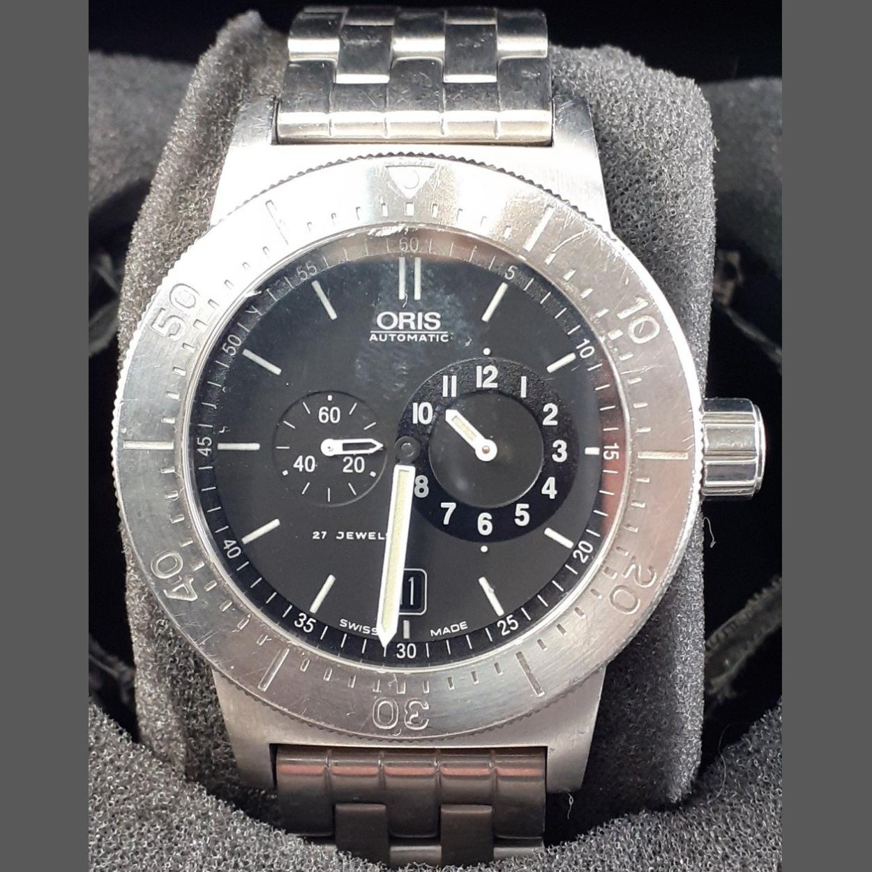 ORIS automatic 27 jewels gents watch with steel bezel and bracelet. Some light wear from use but an impressive watch, working well at valuation. Box with wear internally.